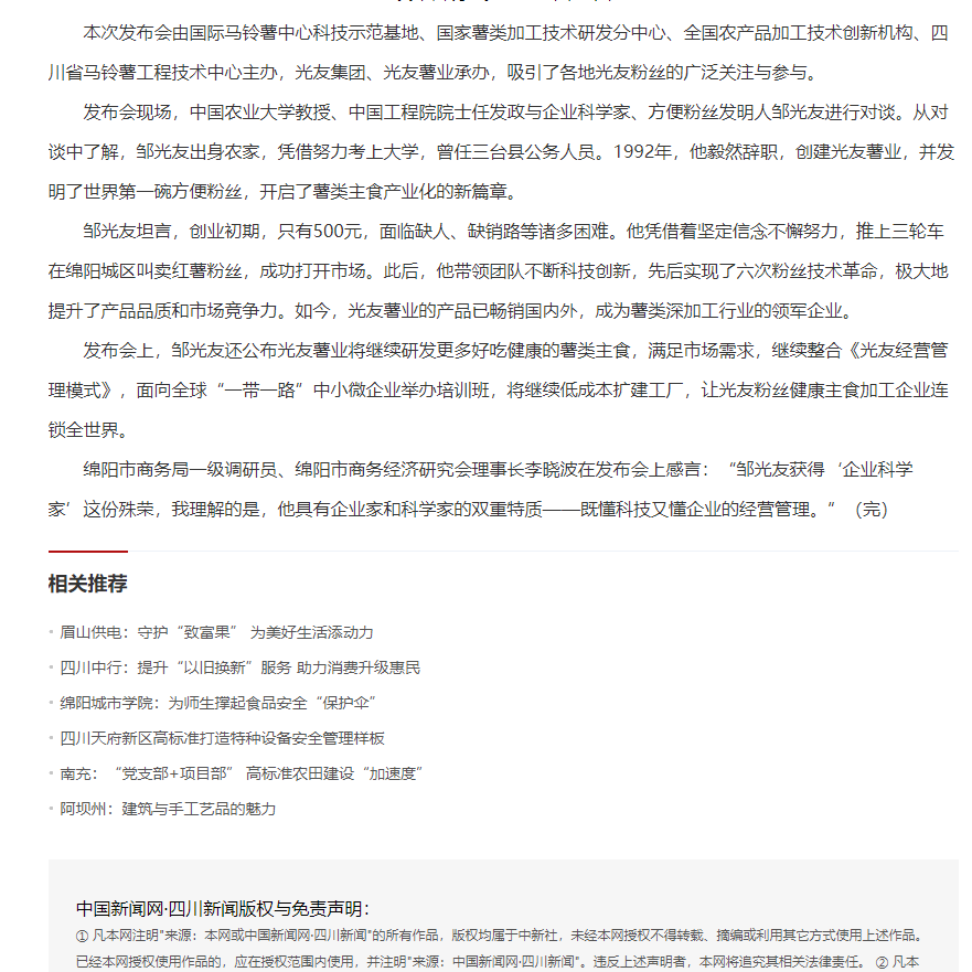 轉(zhuǎn)載中國新聞網(wǎng)·四川新聞——方便粉絲發(fā)明人鄒光友:科技創(chuàng)業(yè)點(diǎn)亮新“薯”光